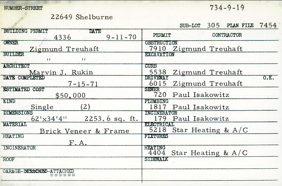 22649 Shelburne Road Shaker Heights, OH 44122 PARCEL ID: 734-09-019 Building Permit Date: 09-11-1970 Plan File Number: 6071, 7454, 10303 Microfilm Roll: Roll#81, Roll#93, NewRoll#3 Neighborhood: Mercer Owner: Treuhaft, Zigmund Builder: Treuhaft, Zigmund Architect: Rukin, Marvin J. Estimated Cost: 50000 Date Completed: 07-15-1971 Kind: Single, Single Residence or Dwelling (2) Material: Brick Veneer and Frame Heating: Forced Air Garage: attached |
