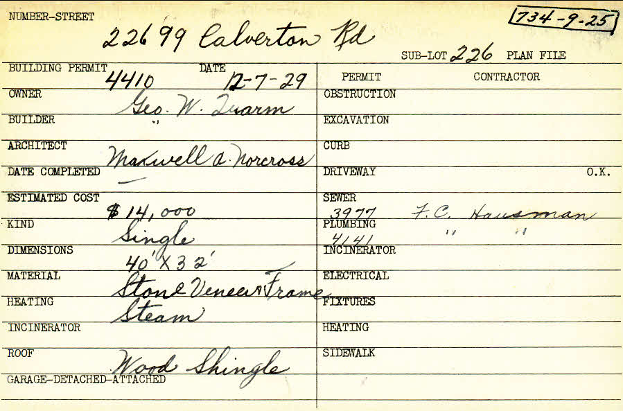 22699 Calverton Road Shaker Heights, OH 44122 PARCEL ID: 734-09-025 Building Permit Date: 12-07-1929 Plan File Number: 0 Neighborhood: Mercer Owner: Quarm, George W. Builder: Quarm, George W. Architect: Norcross, Maxwell A. Estimated Cost: 14000 Kind: Single, Single Residence or Dwelling Material: Stone Veneer and Frame Heating: Steam Roof: Wood Shingle Card Available: yes |