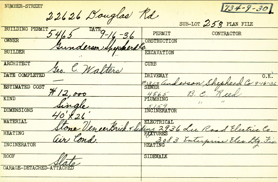 22626 Douglas Road Shaker Heights, OH 44122 PARCEL ID: 734-09-030 Building Permit Date: 09-16-1936 Neighborhood: Mercer Owner: Gunderson Shepherd Company Builder: Gunderson Shepherd Company Architect: Walters, George C. Estimated Cost: 12000 Kind: Single, Single Residence or Dwelling Material: Stone Veneer, Brick and Siding Heating: Air Conditioned Roof: Slate Blueprints: no blueprints on microfilm |