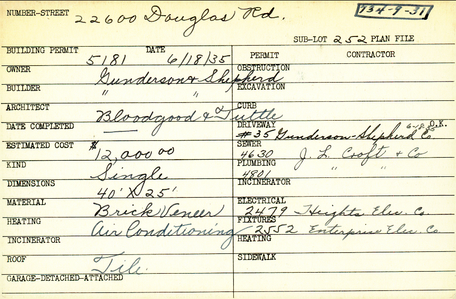 22600 Douglas Road Shaker Heights, OH 44122 PARCEL ID: 734-09-031 Building Permit Date: 06-18-1935 Plan File Number: 0 Neighborhood: Mercer Owner: Gunderson and Shepherd Builder: Gunderson and Shepherd Architect: Tuttle, Bloodgood Estimated Cost: 12000 Kind: Single, Single Residence or Dwelling Material: Brick Veneer Heating: Air Conditioned Roof: Tile Card Available: yes |