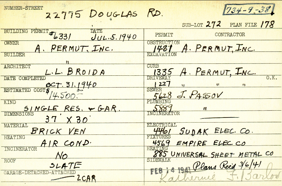 22775 Douglas Road Shaker Heights, OH 44122 PARCEL ID: 734-09-038 Building Permit Date: 07-05-1940 Plan File Number: 178, 5256 Microfilm Roll: Roll#72 Neighborhood: Mercer Owner: A. Permut, Inc. Builder: A. Permut, Inc. Architect: Broida, L. L. Estimated Cost: 14500 Date Completed: 10-31-1940 Kind: Single Dwelling and Garage Material: Brick Veneer Heating: Air Conditioned Roof: Slate Garage: attached 2 car |