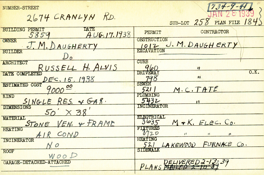 2674 Cranlyn Road Shaker Heights, OH 44122 PARCEL ID: 734-09-041 Building Permit Date: 08-17-1938 Plan File Number: 184, 11233 Microfilm Roll: NewRoll#7 Neighborhood: Mercer Owner: Daugherty, J. M. Builder: Daugherty, J. M. Architect: Alvis, Russell H. Estimated Cost: 9000 Date Completed: 12-15-1938 Kind: Single Dwelling and Garage Material: Stone Veneer and Frame Heating: Air Conditioned Roof: Wood Garage: attached |
