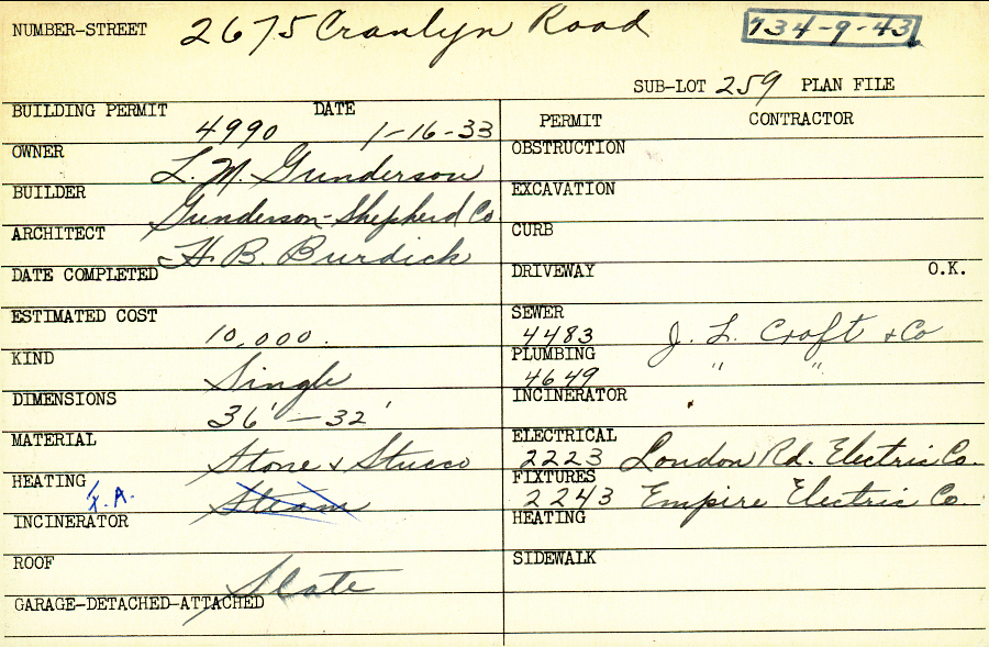 2675 Cranlyn Road Shaker Heights, OH 44122 PARCEL ID: 734-09-043 Building Permit Date: 01-16-1933 Plan File Number: 0 Neighborhood: Mercer Owner: Gunderson, L. M. Builder: Gunderson and Shepherd Company Architect: Burdick, H. B. Estimated Cost: 10000 Kind: Single, Single Residence or Dwelling Material: Stone and Stucco Heating: Forced Air Roof: Slate |