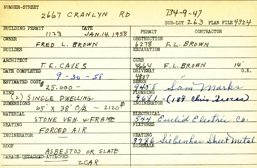 2667 Cranlyn Road Shaker Heights, OH 44122 PARCEL ID: 734-09-047 Building Permit Date: 01-14-1958 Plan File Number: 4324 all scanned Microfilm Roll: Roll062 Neighborhood: Mercer Owner: Brown, Fred L. Architect: Caves, T. E. Estimated Cost: 25000 Date Completed: 09-30-1958 Kind: Single 2-1/2 Material: Stone Veneer and Frame Heating: Forced Air Roof: Slate Garage: attached 2 car |
