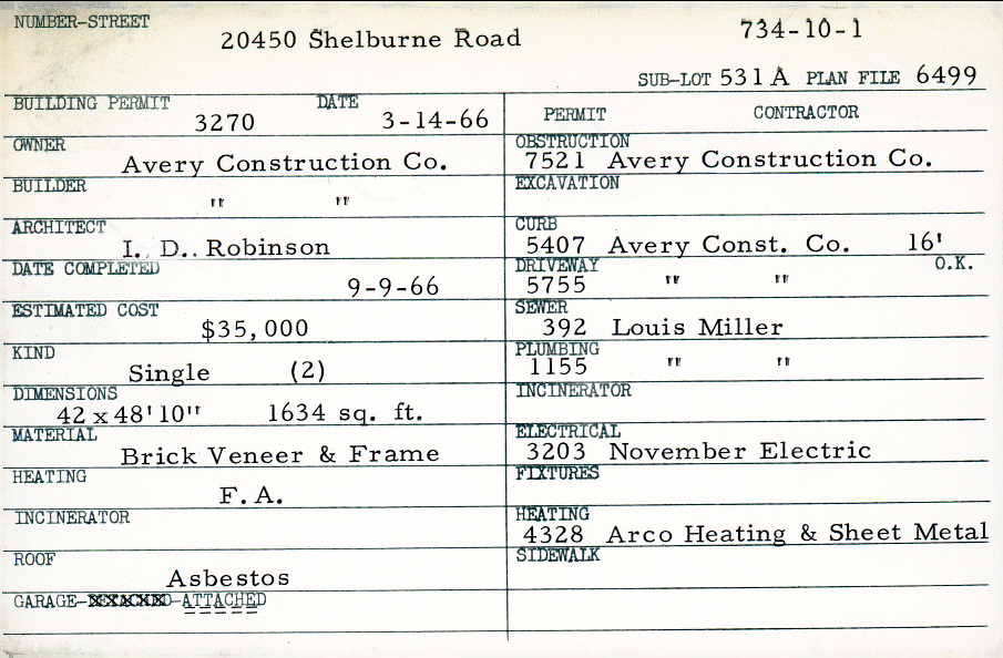 20450 Shelburne Road Shaker Heights, OH 44122 PARCEL ID: 734-10-001 Building Permit Date: 03-14-1966 Plan File Number: 6499 Microfilm Roll: Roll#86 Neighborhood: Mercer Owner: Avery Construction Company Builder: Avery Construction Company Architect: Robinson, I. D. Estimated Cost: 35000 Date Completed: 09-09-1966 Kind: Single, Single Residence or Dwelling (2) Material: Brick Veneer and Frame Heating: Forced Air Roof: Asbestos Garage: attached |