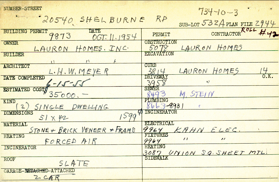 20540 Shelburne Road Shaker Heights, OH 44122 PARCEL ID: 734-10-003 Building Permit Date: 10-11-1954 Plan File Number: 2944 Microfilm Roll: Roll#42 Neighborhood: Mercer Owner: Lauron Homes Inc Builder: Lauron Homes Inc Architect: Meyer, L. H. W. Estimated Cost: 35000 Date Completed: 06-15-1955 Kind: Single, Single Residence or Dwelling (2) Material: Stone and Brick Veneer and Frame Heating: Forced Air Roof: Slate Garage: attached 2 car |