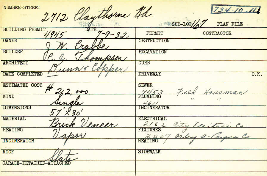 2712 Claythorne Road Shaker Heights, OH 44122 PARCEL ID: 734-10-011 Building Permit Date: 07-09-1932 Plan File Number: 0 Neighborhood: Mercer Owner: Crabbe, J. W. Builder: Thompson, C. A. Architect: Dunn and Copper Estimated Cost: 22000 Kind: Single, Single Residence or Dwelling Material: Brick Veneer Heating: Vapor Roof: Slate Card Available: yes |