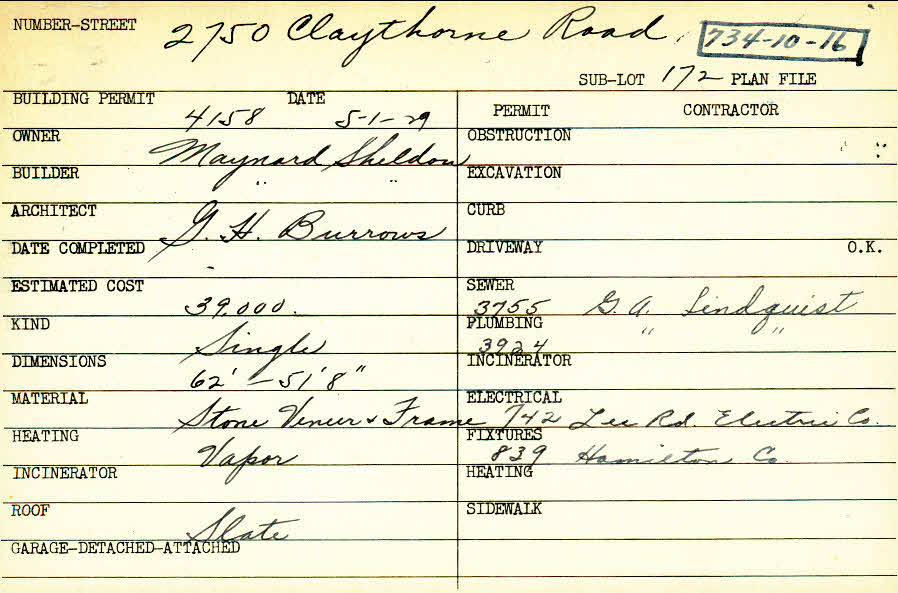 2750 Claythorne Road Shaker Heights, OH 44122 PARCEL ID: 734-10-016 Building Permit Date: 05-01-1929 Plan File Number: 385 all scanned Microfilm Roll: Roll004 Neighborhood: Mercer Owner: Maynard, Sheldon Builder: Maynard, Sheldon Architect: Burrows, George H. Estimated Cost: 39000 Kind: Single, Single Residence or Dwelling Material: Stone Veneer and Frame Heating: Vapor Roof: Slate |