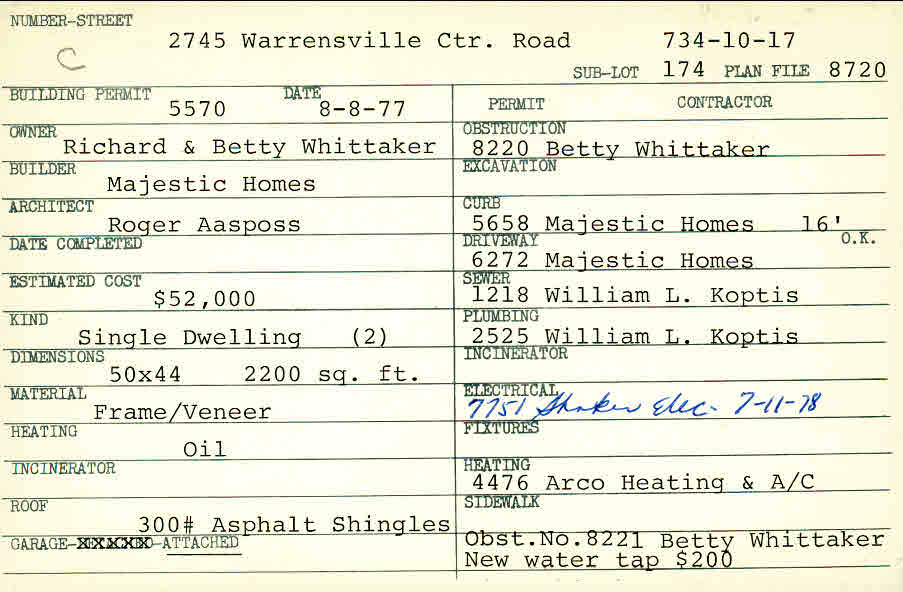 2745 Warrensville Center Road Shaker Heights, OH 44122 PARCEL ID: 734-10-017 Building Permit Date: 08-08-1977 Plan File Number: 8720 Microfilm Roll: Roll#98 Neighborhood: Malvern Owner: Whittaker, Richard and Betty Builder: Majestic Homes Architect: Aasposs, Roger Estimated Cost: 52000 Kind: Single, Single Residence or Dwelling (2) Material: Frame / Veneer Roof: 300# Min Asphalt Garage: attached |