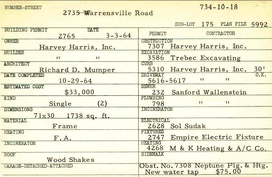 2735 Warrensville Center Road Shaker Heights, OH 44122 PARCEL ID: 734-10-018 Building Permit Date: 03-03-1964 Plan File Number: 5992 Microfilm Roll: Roll#80 Neighborhood: Malvern Owner: Harvey Harris, Inc. Builder: Harvey Harris, Inc. Architect: Mumper, Richard D. Estimated Cost: 33000 Date Completed: 10-29-1964 Kind: Single, Single Residence or Dwelling Material: Frame Heating: Forced Air Roof: Wood Shakes |