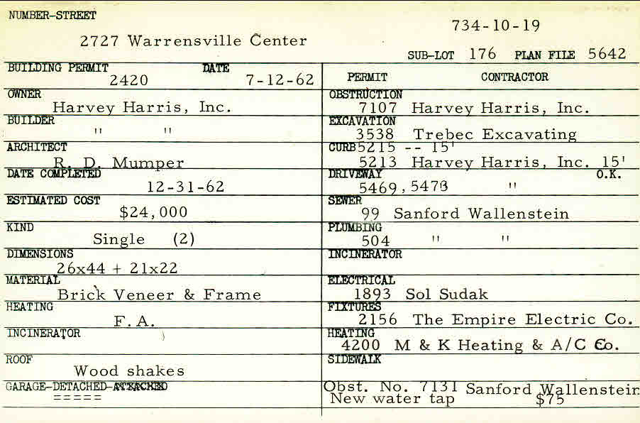 2727 Warrensville Center Road Shaker Heights, OH 44122 PARCEL ID: 734-10-019 Building Permit Date: 07-12-1962 Plan File Number: 5642 Microfilm Roll: Roll#76 Neighborhood: Malvern Owner: Harvey Harris, Inc. Builder: Harvey Harris, Inc. Architect: Mumper, R. D. Estimated Cost: 24000 Date Completed: 12-31-1962 Kind: Single, Single Residence or Dwelling (2) Material: Brick Veneer and Frame Heating: Forced Air Roof: Wood Shakes Garage: detached |