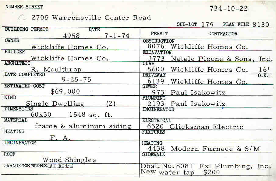 2705 Warrensville Center Road Shaker Heights, OH 44122 PARCEL ID: 734-10-022 Building Permit Date: 07-01-1974 Plan File Number: 8130 Microfilm Roll: Roll#97, Roll#99 Neighborhood: Malvern Owner: Wickliffe Homes Company Builder: Wickliffe Homes Company Architect: Moulthrop, R. Estimated Cost: 69000 Date Completed: 09-25-1975 Kind: Single, Single Residence or Dwelling (2) Material: Frame and Aluminum Siding Heating: Forced Air Roof: Wood Shingle Garage: attached |