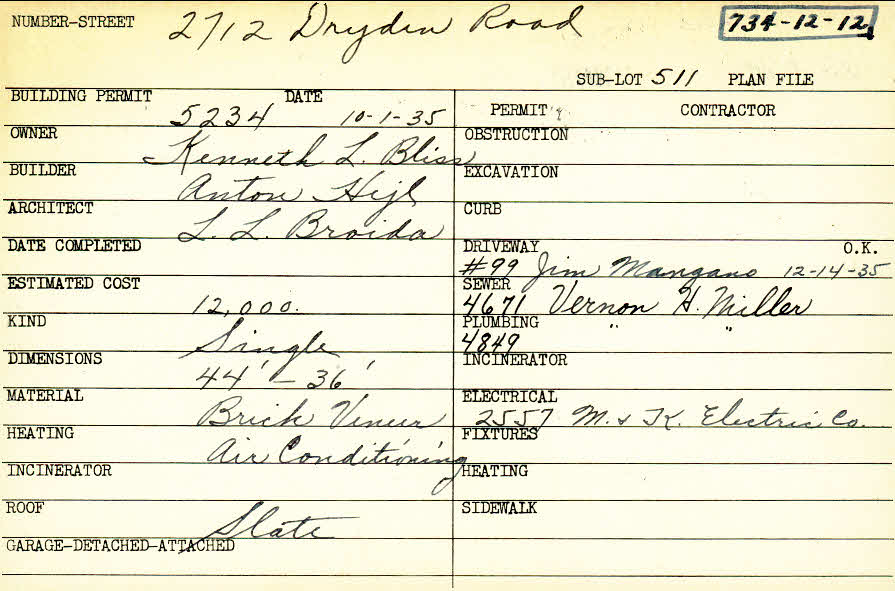 2712 Dryden Road Shaker Heights, OH 44122 PARCEL ID: 734-12-012 Building Permit Date: 10-01-1935 Plan File Number: 0 Neighborhood: Mercer Owner: Bliss, Kenneth L. Builder: Hejl, Anton Architect: Broida, L. L. Estimated Cost: 12000 Kind: Single, Single Residence or Dwelling Material: Brick Vener Heating: Air Conditioned Roof: Slate Card Available: yes |