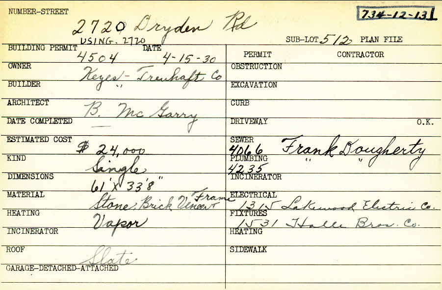 2720 Dryden Road Shaker Heights, OH 44122 PARCEL ID: 734-12-013 Pictured in Keyes-Treuhaft's Distinctive Dwellings, p. 7 Building Permit Date: 04-15-1930 Plan File Number: 5041, 12473, 12783 Microfilm Roll: Roll#69, NewRoll#13, NewRoll#15 Neighborhood: Mercer Owner: Keyes-Treuhaft Company Builder: Keyes-Treuhaft Company Architect: McGarry, B. Estimated Cost: 24000 Kind: Single, Single Residence or Dwelling Material: Stone, Brick Veneer and Frame Heating: Vapor Roof: Slate |