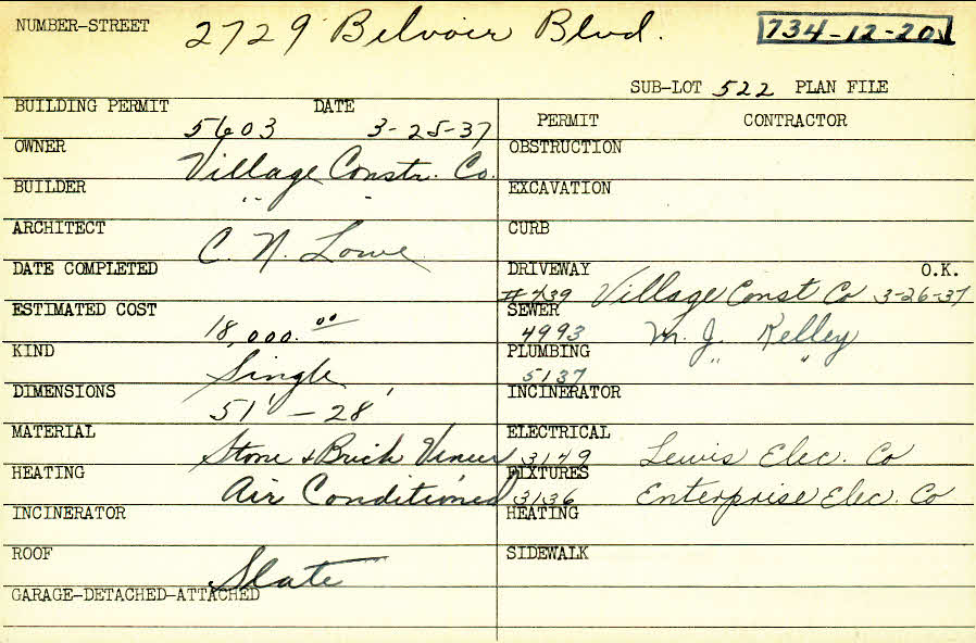 2729 Belvoir Boulevard Shaker Heights, OH 44122 PARCEL ID: 734-12-020 Building Permit Date: 03-25-1937 Plan File Number: 11176 Microfilm Roll: NewRoll#7 Neighborhood: Mercer Owner: Village Construction Company Builder: Village Construction Company Architect: Lowe, C. N. Estimated Cost: 18000 Kind: Single, Single Residence or Dwelling Material: Stone and Brick Veneer Heating: Air Conditioned Roof: Slate |