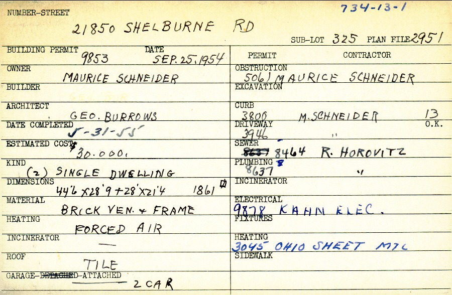 21850 Shelburne Road Shaker Heights, OH 44122 PARCEL ID: 734-13-001 Building Permit Date: 09-25-1954 Plan File Number: 2951 Microfilm Roll: Roll#42 Neighborhood: Mercer Owner: Schneider, Maurice Builder: Schneider, Maurice Architect: Burrows, George Estimated Cost: 30000 Date Completed: 05-31-1955 Kind: Single, Single Residence or Dwelling (2) Material: Brick Veneer and Frame Heating: Forced Air Roof: Tile Garage: attached 2 car |