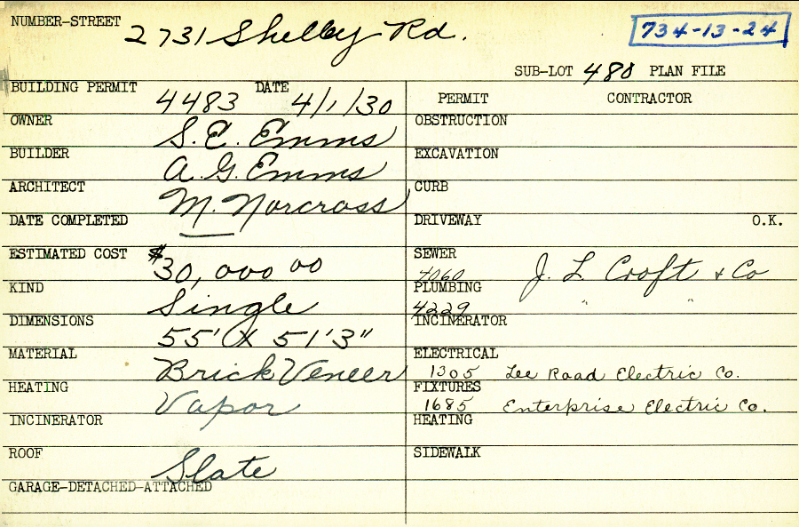 2731 Shelley Road Shaker Heights, OH 44122 PARCEL ID: 734-13-024 Building Permit Date: 04-01-1930 Plan File Number: 3952, 4299 scanned, 6650 Microfilm Roll: Roll#58, Roll062, Roll#87 Neighborhood: Mercer Owner: Emms, S. E. Builder: Emms, A. G. Architect: Norcross, M. Estimated Cost: 30000 Kind: Single, Single Residence or Dwelling Material: Brick Veneer Heating: Vapor Roof: Slate |