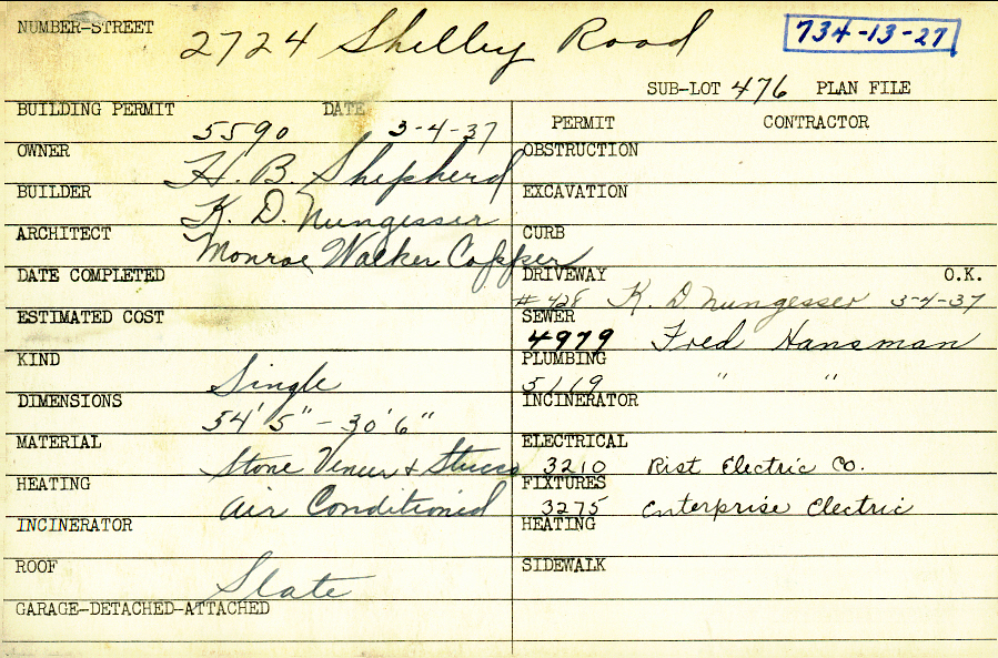 2724 Shelley Road Shaker Heights, OH 44122 PARCEL ID: 734-13-027 Building Permit Date: 03-04-1937 Plan File Number: 3741 Microfilm Roll: Roll#51 Neighborhood: Mercer Owner: Shepherd, H. B. Builder: Nungesser, K. D. Architect: Copper, Munroe Walker Jr. Kind: Single, Single Residence or Dwelling Material: Stone Veneer and Stucco Heating: Air Conditioned Roof: Slate |