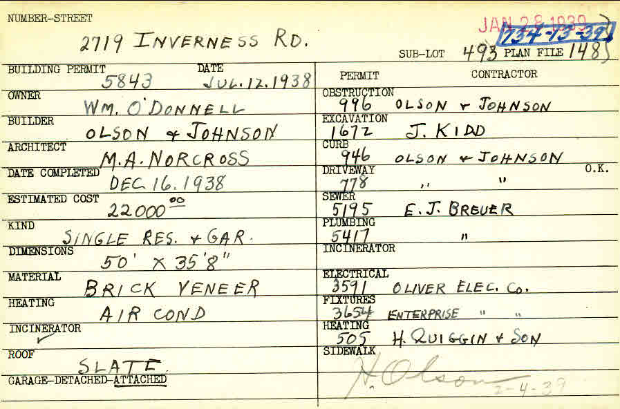 2719 Inverness Road Shaker Heights, OH 44122 PARCEL ID: 734-13-039 Building Permit Date: 07-12-1938 Plan File Number: 1485 Neighborhood: Mercer Owner: O'Donnell, William Builder: Olson and Johnson Architect: Norcross, M. A. Estimated Cost: 22000 Date Completed: 12-16-1938 Kind: Single Dwelling and Garage Material: Brick Veneer Heating: Air Conditioned Roof: Slate Garage: attached |