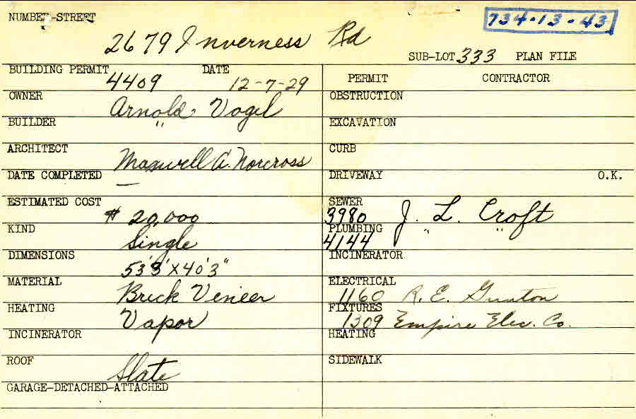 2679 Inverness Road Shaker Heights, OH 44122 PARCEL ID: 734-13-043 Building Permit Date: 12-07-1929 Plan File Number: 2295, 6675 all scanned Microfilm Roll: Roll034, Roll087 Neighborhood: Mercer Owner: Vogel, Arnold Builder: Vogel, Arnold Architect: Norcross, Maxwell A. Estimated Cost: 20000 Kind: Single, Single Residence or Dwelling Material: Brick Veneer Heating: Vapor Roof: Slate Blueprints: online, see link above |