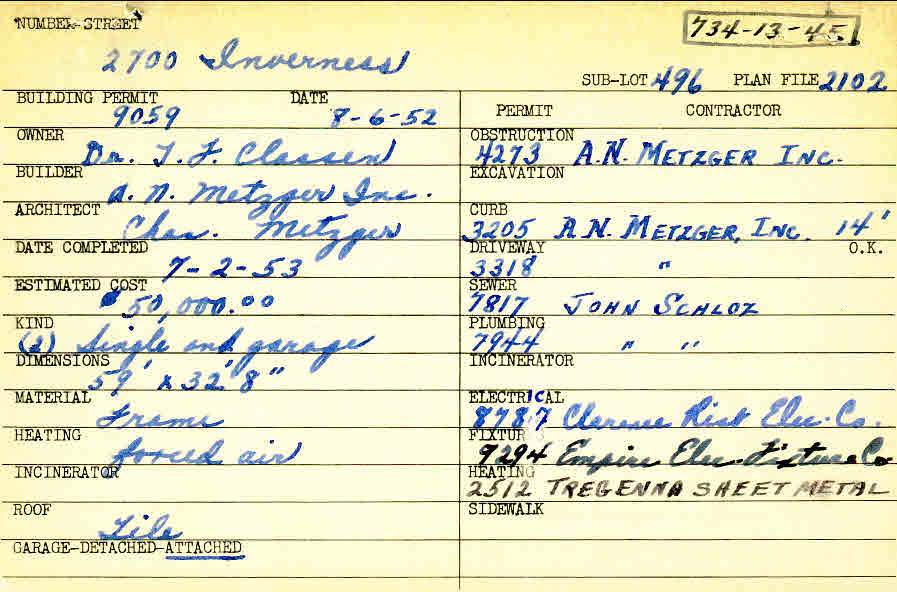 2700 Inverness Road Shaker Heights, OH 44122 PARCEL ID: 734-13-045 Building Permit Date: 08-06-1952 Plan File Number: 2102, 4804, 4828, 5359 Microfilm Roll: Roll#32, Roll#66, Roll#73 Neighborhood: Mercer Owner: Classen, Dr. T. J. Builder: A. N. Metzger Inc. Architect: Metzger, Charles A. Estimated Cost: 50000 Date Completed: 07-02-1953 Kind: Single, Single Residence or Dwelling (2) Material: Frame Heating: Forced Air Roof: Tile Garage: attached |