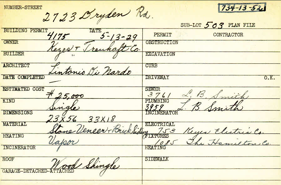 2723 Dryden Road Shaker Heights, OH 44122 PARCEL ID: 734-13-052 Building Permit Date: 05-13-1929 Plan File Number: 6896 Microfilm Roll: Roll#89 Neighborhood: Mercer Owner: Keyes-Treuhaft Company Builder: Keyes-Treuhaft Company Architect: Di Nardo, Lintonio Estimated Cost: 25000 Kind: Single, Single Residence or Dwelling Material: Stone Venner & Brick Siding Heating: Vapor Roof: Wood Shingle |