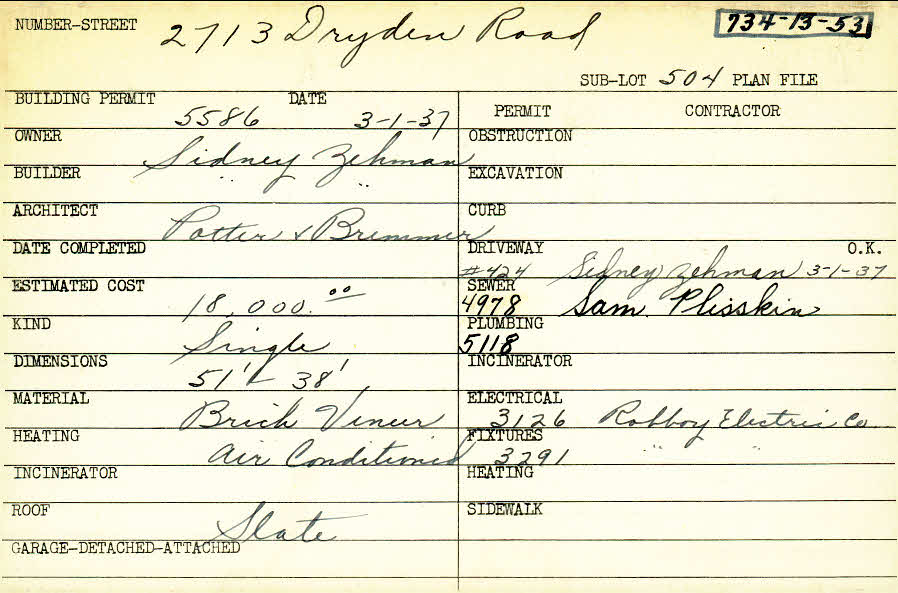 2713 Dryden Road Shaker Heights, OH 44122 PARCEL ID: 734-13-053 Building Permit Date: 03-01-1937 Plan File Number: 0 Neighborhood: Mercer Owner: Zehman, Sidney Builder: Zehman, Sidney Architect: J. Ellsworth Potter and Harry F. Bremmer Estimated Cost: 18000 Kind: Single, Single Residence or Dwelling Material: Brick Veneer Heating: Air Conditioned Roof: Slate |
