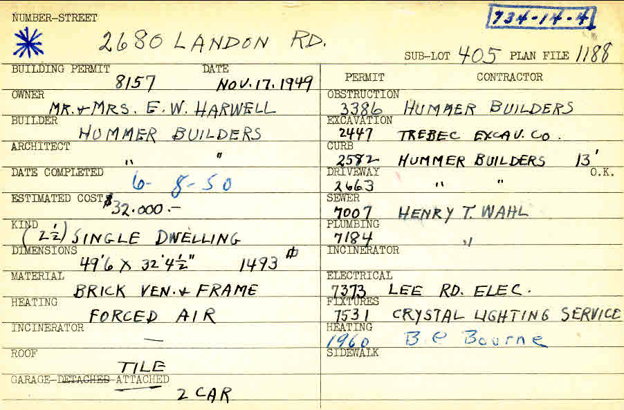 2680 Landon Road Shaker Heights, OH 44122 PARCEL ID: 734-14-004 Building Permit Date: 11-17-1949 Plan File Number: 1188 all scanned Microfilm Roll: Roll014 Neighborhood: Mercer Owner: Harwell, Mr. and Mrs. E.W. Builder: Hummer Builders Architect: Hummer Builders Estimated Cost: 32000 Date Completed: 06-08-1950 Kind: Single 2-1/2 Material: Brick Veneer and Frame Heating: Forced Air Roof: Tile Garage: attached 2 car Blueprints: online, see link above |