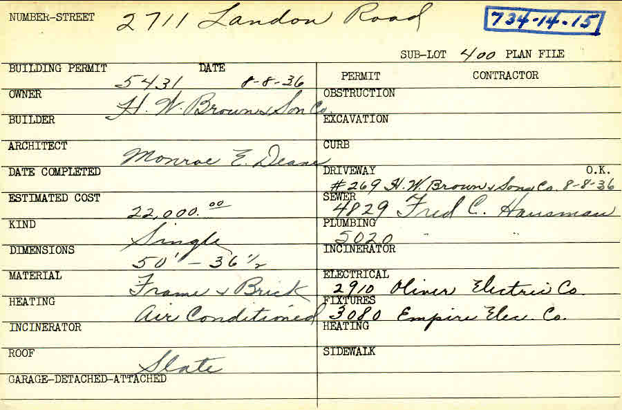 2711 Landon Road Shaker Heights, OH 44122 PARCEL ID: 734-14-015 Building Permit Date: 08-08-1936 Plan File Number: 4780 Microfilm Roll: Roll#66 Neighborhood: Mercer Owner: H. W. Brown and Son Company Architect: Deane, Monroe Ensign Estimated Cost: 22000 Kind: Single, Single Residence or Dwelling Material: Frame and Brick Heating: Air Conditioned Roof: Slate |