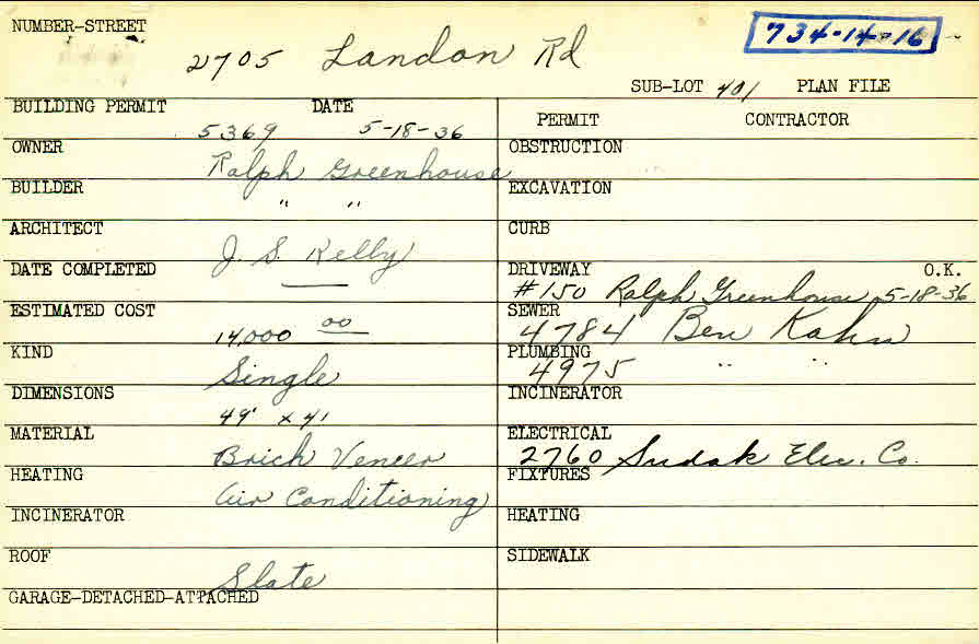 2705 Landon Road Shaker Heights, OH 44122 PARCEL ID: 734-14-016 Building Permit Date: 05-18-1936 Plan File Number: 11146 Microfilm Roll: NewRoll#7 Neighborhood: Mercer Owner: Greenhouse, Ralph Builder: Greenhouse, Ralph Architect: Kelly, John Sherwood Estimated Cost: 14000 Kind: Single, Single Residence or Dwelling Material: Brick Veneer Heating: Air Conditioned Roof: Slate |