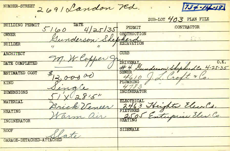 2691 Landon Road Shaker Heights, OH 44122 PARCEL ID: 734-14-018 Building Permit Date: 04-25-1935 Plan File Number: 4258 all scanned Microfilm Roll: Roll062 Neighborhood: Mercer Owner: Gunderson - Shepherd Builder: Gunderson - Shepherd Architect: Copper, Munroe Walker Jr. Estimated Cost: 12000 Kind: Single, Single Residence or Dwelling Material: Brick Veneer Roof: Slate Blueprints: online, see link above |
