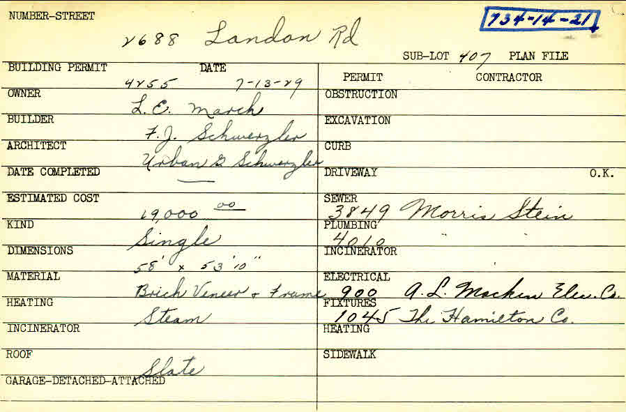 2688 Landon Road Shaker Heights, OH 44122 PARCEL ID: 734-14-021 Building Permit Date: 07-13-1929 Plan File Number: 3715 Microfilm Roll: Roll#51 Neighborhood: Mercer Owner: March, L. E. Builder: Schwerzler, F. J. Architect: Schwerzler, Urban G. Estimated Cost: 19000 Kind: Single, Single Residence or Dwelling Material: Brick Veneer and Frame Heating: Steam Roof: Slate |