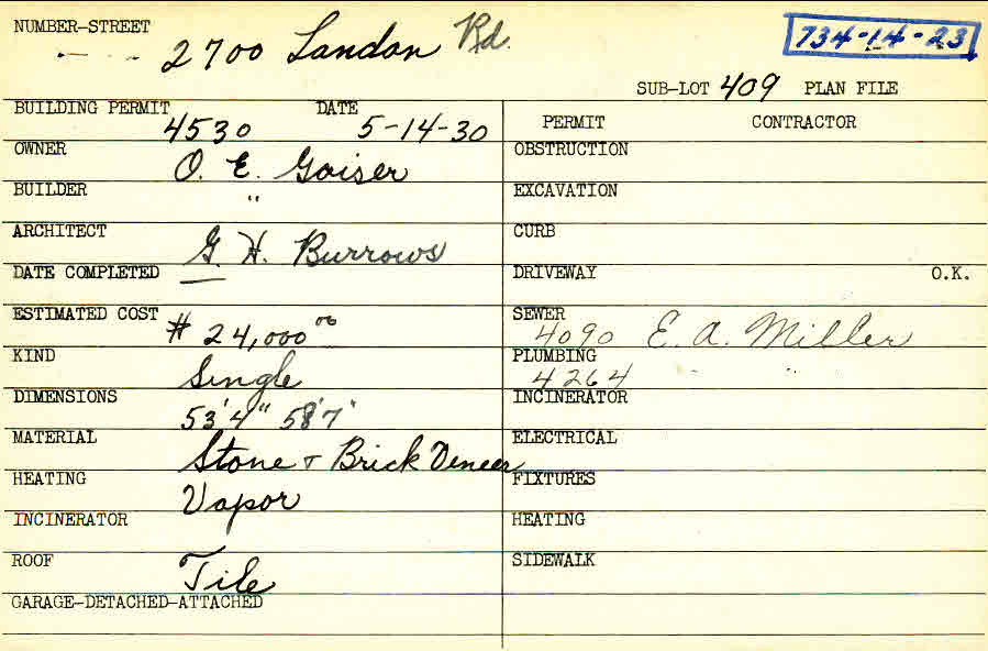 2700 Landon Road Shaker Heights, OH 44122 PARCEL ID: 734-14-023 Building Permit Date: 05-14-1930 Plan File Number: 12369 all scanned Microfilm Roll: NewRoll12 Neighborhood: Mercer Owner: Gaiser, O. E. Builder: Gaiser, O. E. Architect: Burrows, G. H. Estimated Cost: 24000 Kind: Single, Single Residence or Dwelling Material: Stone and Brick Veneer Heating: Vapor Roof: Tile Blueprints: online, see link above |