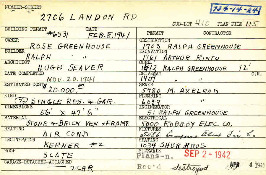 2706 Landon Road Shaker Heights, OH 44122 PARCEL ID: 734-14-024 Building Permit Date: 02-05-1941 Plan File Number: 115, 7738 Microfilm Roll: Roll#94 Neighborhood: Mercer Owner: Greenhouse, Rose Builder: Greenhouse, Ralph Architect: Seaver, Hugh Estimated Cost: 20000 Date Completed: 11-20-1941 Kind: Single Dwelling and Garage (2) Material: Stone and Brick Veneer and Frame Heating: Air Conditioned Roof: Slate Garage: attached 2 car |