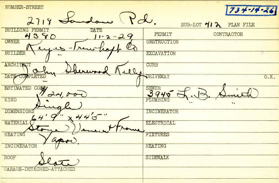 2718 Landon Road Shaker Heights, OH 44122 PARCEL ID: 734-14-026 Building Permit Date: 11-02-1929 Plan File Number: 0 Neighborhood: Mercer Owner: Keyes-Treuhaft Company Builder: Keyes-Treuhaft Company Architect: Kelly, John Sherwood Estimated Cost: 24000 Kind: Single, Single Residence or Dwelling Material: Stone Veneer and Frame Heating: Vapor Roof: Slate |