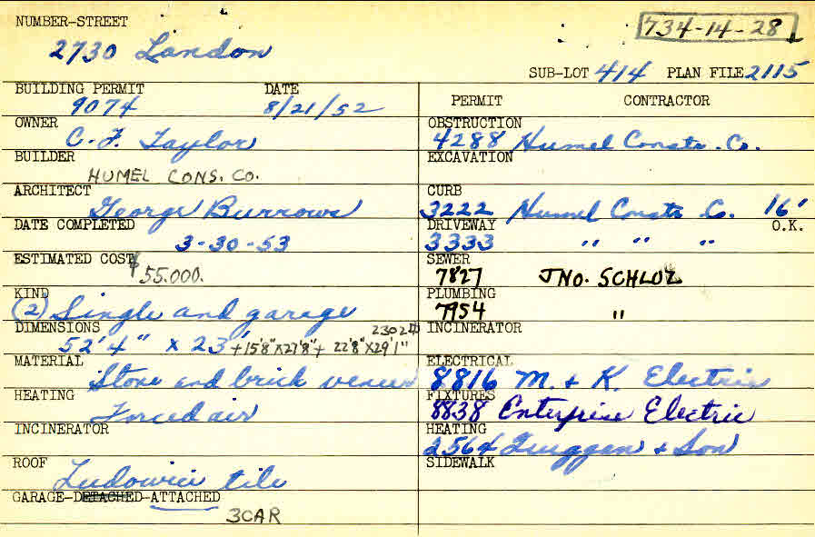 2730 Landon Road Shaker Heights, OH 44122 PARCEL ID: 734-14-028 Building Permit Date: 08-21-1952 Plan File Number: 2115, 11909 Microfilm Roll: Roll#32, NewRoll#10 Neighborhood: Mercer Owner: Taylor, C. F. Builder: Humel Construction Company Architect: Burrows, George Estimated Cost: 55000 Date Completed: 03-30-1953 Kind: Single Dwelling and Garage (2) Material: Stone and Brick Veneer Heating: Forced Air Roof: Tile Garage: attached 3 car |