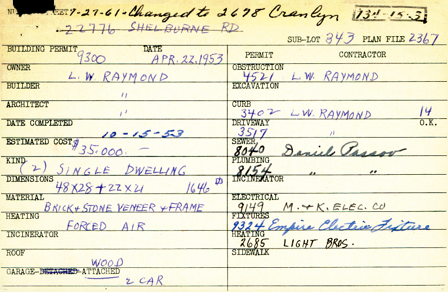 2678 Cranlyn Road Shaker Heights, OH 44122 PARCEL ID: 734-15-003 Building Permit Date: 04-22-1953 Plan File Number: 2367, 5426, 6483 Microfilm Roll: Roll#73, Roll#86 Neighborhood: Mercer Owner: Raymond, Lawrence W. Builder: Raymond, Lawrence W. Architect: Raymond, Lawrence W. Estimated Cost: 35000 Date Completed: 10-15-1953 Kind: Single, Single Residence or Dwelling (2) Material: Brick and Stone Veneer and Frame Heating: Forced Air Roof: Wood Garage: attached 2 car |