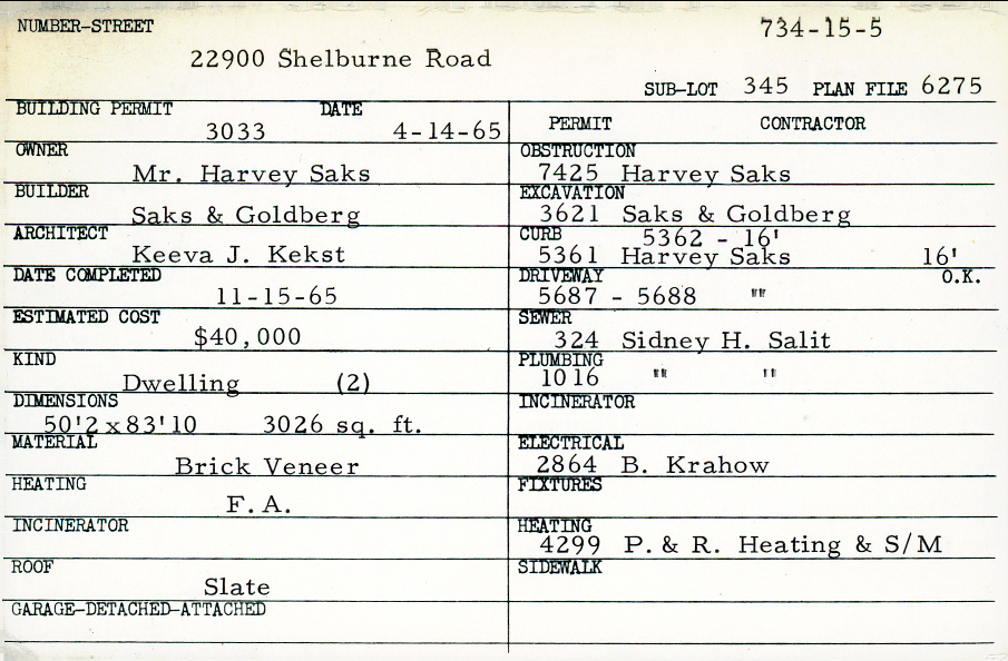 22900 Shelburne Road Shaker Heights, OH 44122 PARCEL ID: 734-15-005 Building Permit Date: 04-14-1965 Plan File Number: 5961, 6275 Microfilm Roll: Roll#80, Roll#84 Neighborhood: Mercer Owner: Saks, Mr. Harvey Builder: Saks and Goldberg Architect: Kekst, Keeva J. Estimated Cost: 40000 Date Completed: 11-15-1965 Kind: Single, Single Residence or Dwelling (2) Material: Brick Veneer Heating: Forced Air Roof: Slate |