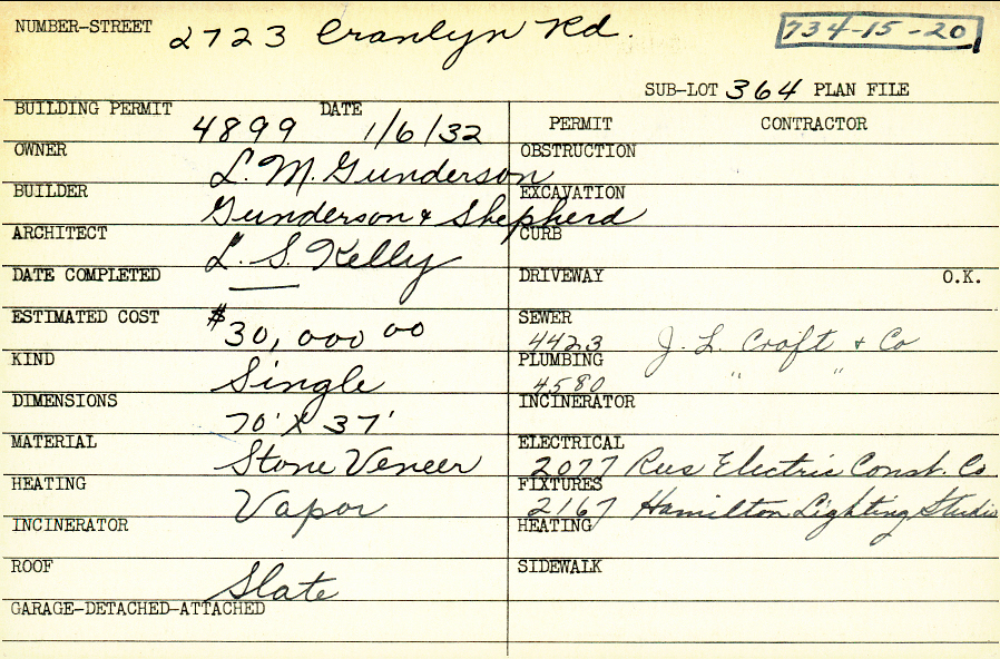 2723 Cranlyn Road Shaker Heights, OH 44122 PARCEL ID: 734-15-020 Building Permit Date: 01-06-1932 Plan File Number: 0 Neighborhood: Mercer Owner: Gunderson, L. M. Builder: Gunderson and Shepherd Architect: Kelly, John Sherwood Estimated Cost: 30000 Kind: Single, Single Residence or Dwelling Material: Stone Veneer Heating: Vapor Roof: Slate |