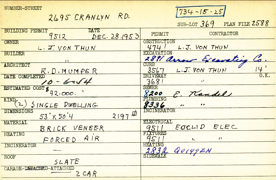 2695 Cranlyn Road Shaker Heights, OH 44122 PARCEL ID: 734-15-025 Building Permit Date: 12-28-1953 Plan File Number: 2588 all scanned Microfilm Roll: Roll036 Neighborhood: Mercer Owner: Von Thun, L. J. Builder: Von Thun, L. J. Architect: Mumper, R. D. Estimated Cost: 42000 Date Completed: 10-06-1954 Kind: Single, Single Residence or Dwelling (2) Material: Brick Veneer Heating: Forced Air Roof: Slate Garage: attached 2 car Blueprints: online, see link above |