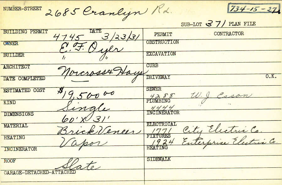 2685 Cranlyn Road Shaker Heights, OH 44122 PARCEL ID: 734-15-027 Building Permit Date: 03-23-1931 Plan File Number: 0 Neighborhood: Mercer Owner: Oyer, Earl F. Builder: Oyer, Earl F. Architect: Norcross and Hays Estimated Cost: 19500 Kind: Single, Single Residence or Dwelling Material: Brick Veneer Heating: Vapor Roof: Slate |