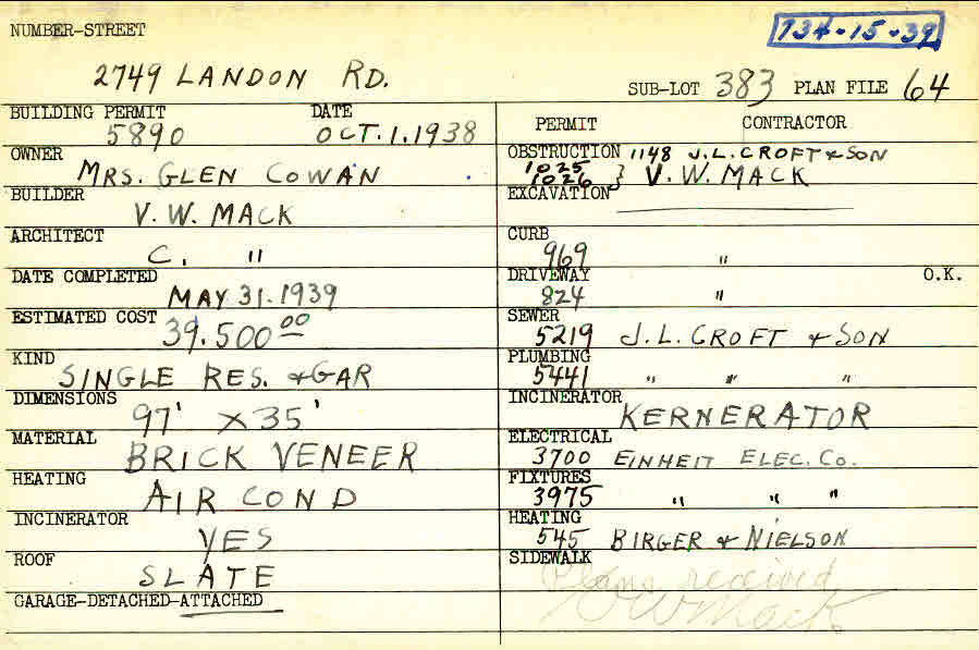 2749 Landon Road Shaker Heights, OH 44122 PARCEL ID: 734-15-039 Building Permit Date: 10-01-1938 Plan File Number: 64 Neighborhood: Mercer Owner: Cowan, Mrs. Glen Builder: Mack, V. W. Architect: Mack, C. Estimated Cost: 39500 Date Completed: 05-31-1939 Kind: Single Dwelling and Garage Material: Brick Veneer Heating: Air Conditioned Roof: Slate Garage: attached Card Available: yes |