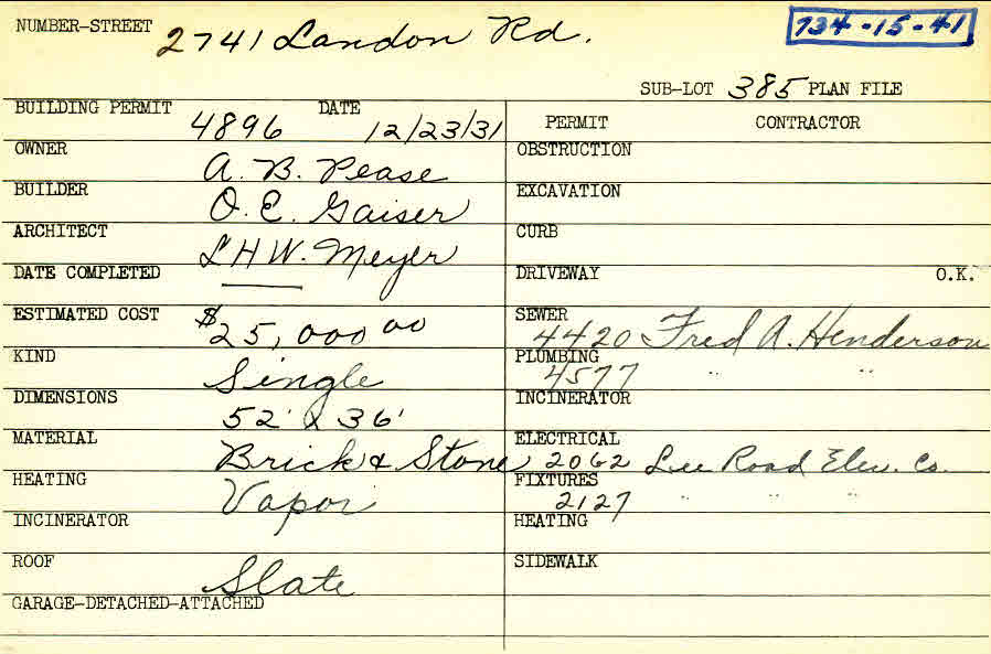 2741 Landon Road Shaker Heights, OH 44122 PARCEL ID: 734-15-041 Building Permit Date: 12-23-1931 Plan File Number: 0 Neighborhood: Mercer Owner: Pease, A. B. Builder: Gaiser, O. E. Architect: Meyer, L. H. W. Estimated Cost: 25000 Kind: Single, Single Residence or Dwelling Material: Brick and Stone Heating: Vapor Roof: Slate |