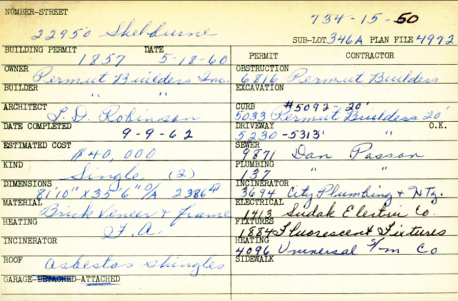 22950 Shelburne Road Shaker Heights, OH 44122 PARCEL ID: 734-15-050 Building Permit Date: 05-18-1960 Plan File Number: 4972 Microfilm Roll: Roll#68 Neighborhood: Mercer Owner: Permut Builders Inc. Builder: Permut Builders Inc. Architect: Robinson, L. D. Estimated Cost: 40000 Date Completed: 09-09-1962 Kind: Single, Single Residence or Dwelling (2) Material: Brick Veneer and Frame Heating: Forced Air Roof: Asbestos Shingles Garage: attached |