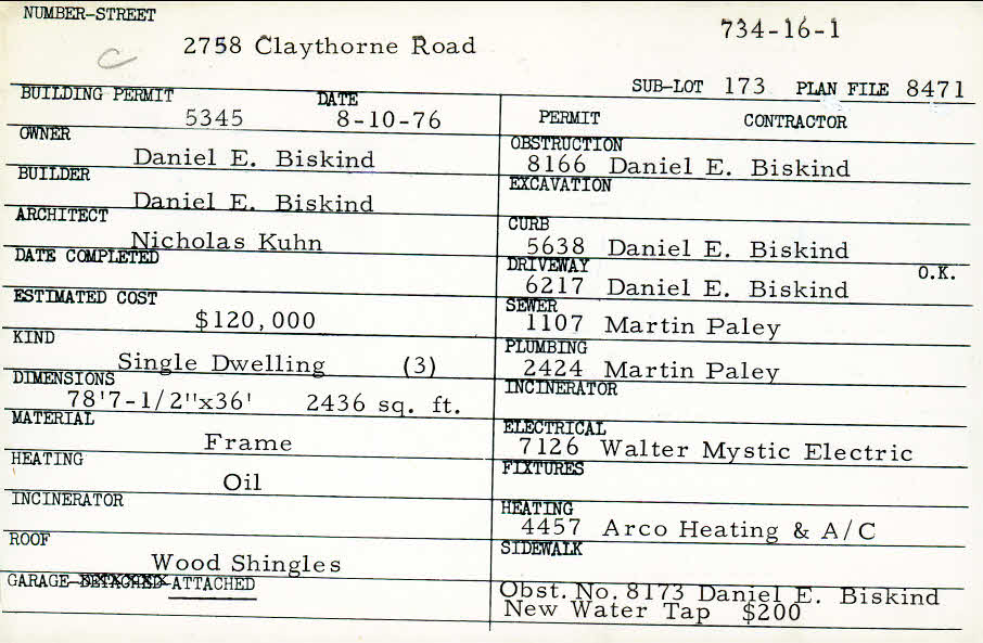 2758 Claythorne Road Shaker Heights, OH 44122 PARCEL ID: 734-16-001 Building Permit Date: 08-10-1976 Plan File Number: 8471 Microfilm Roll: Roll#97 Neighborhood: Mercer Owner: Biskind, Daniel E. Builder: Biskind, Daniel E. Architect: Kuhn, Nicholas Estimated Cost: 120000 Kind: Single 2-1/2 Material: Frame Roof: Wood Shingle Garage: attached |