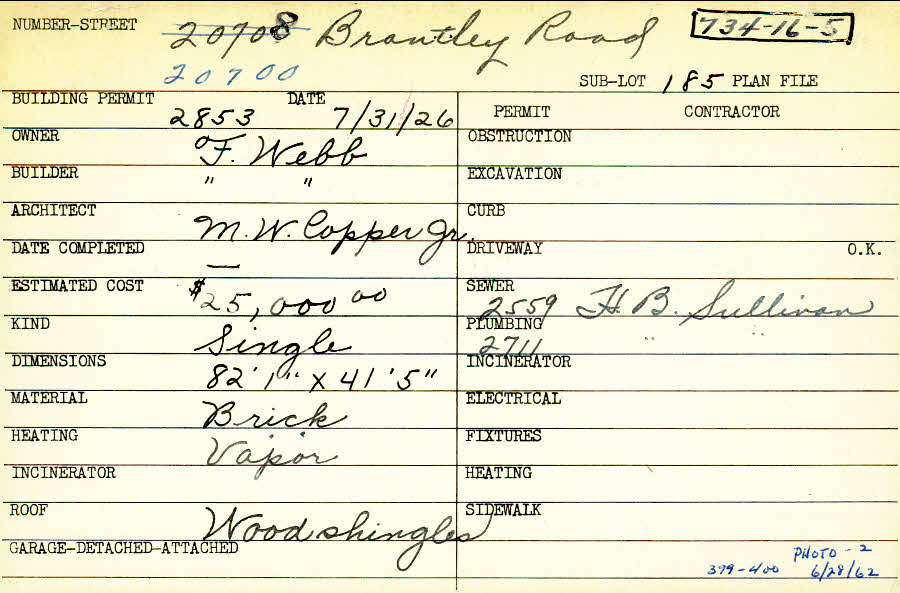 20700 Brantley Road Shaker Heights, OH 44122 PARCEL ID: 734-16-005 Building Permit Date: 07-31-1926 Plan File Number: 6112 Microfilm Roll: Roll#83 Neighborhood: Mercer Owner: Webb, F. Builder: Webb, F. Architect: Copper, Munroe Walker Jr. Estimated Cost: 25000 Kind: Single, Single Residence or Dwelling Material: Brick Heating: Vapor Roof: Wood Shingle |