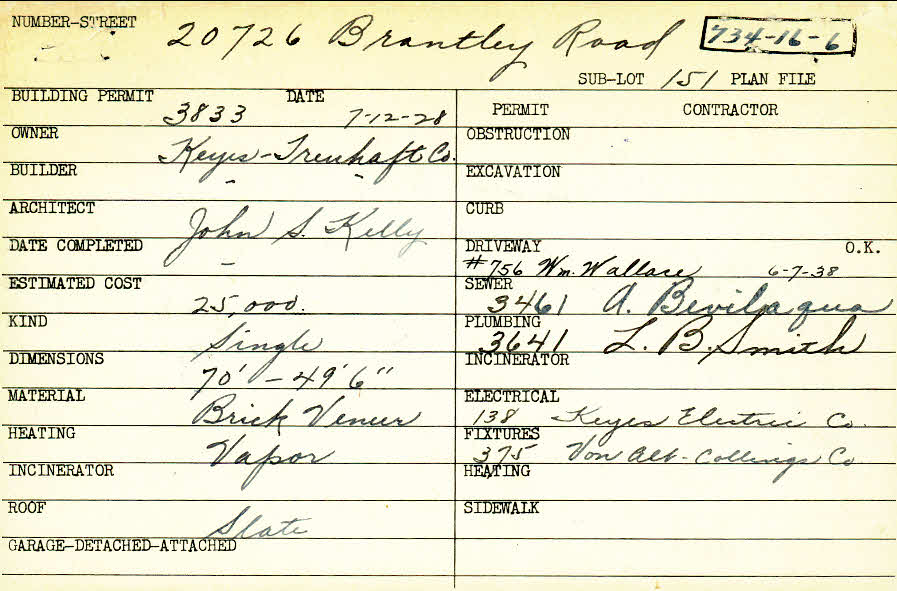20726 Brantley Road Shaker Heights, OH 44122 PARCEL ID: 734-16-006 Building Permit Date: 07-12-1928 Neighborhood: Mercer Owner: Keyes-Treuhaft Company Builder: Keyes-Treuhaft Company Architect: Kelly, John Sherwood Estimated Cost: 25000 Kind: Single, Single Residence or Dwelling Material: Brick Veneer Heating: Vapor Roof: Slate Blueprints: no blueprints on microfilm |