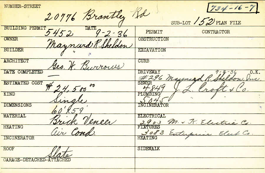 20776 Brantley Road Shaker Heights, OH 44122 PARCEL ID: 734-16-007 Building Permit Date: 09-02-1936 Plan File Number: 0 Neighborhood: Mercer Owner: Sheldon, Maynard R. Builder: Sheldon, Maynard R. Architect: Burrows, George H. Estimated Cost: 24500 Kind: Single, Single Residence or Dwelling Material: Brick Veneer Heating: Air Conditioned Roof: Slate |