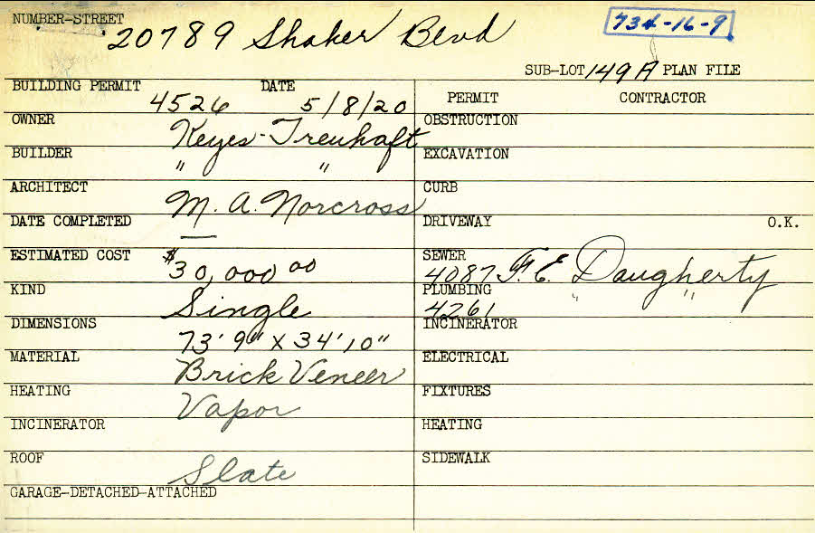 20789 Shaker Boulevard Shaker Heights, OH 44122 PARCEL ID: 734-16-009 Pictured in Keyes-Treuhaft's Distinctive Dwellings, p. 3 Building Permit Date: 05-08-1920 Plan File Number: 0 Neighborhood: Malvern Owner: Keyes - Treuhaft Builder: Keyes - Treuhaft Architect: Norcross, M. A. Estimated Cost: 30000 Kind: Single, Single Residence or Dwelling Material: Brick Veneer Heating: Vapor Roof: Slate |