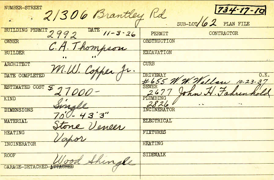 21306 Brantley Road Shaker Heights, OH 44122 PARCEL ID: 734-17-010 Building Permit Date: 11-03-1926 Plan File Number: 6500 all scanned Microfilm Roll: Roll086 Neighborhood: Mercer Owner: Thompson, C. A. Builder: Thompson, C. A. Architect: Copper, Munroe Walker Jr. Estimated Cost: 27000 Kind: Single, Single Residence or Dwelling Material: Stone Veneer Heating: Vapor Roof: Wood Shingle Garage: detached Blueprints: online, see link above |